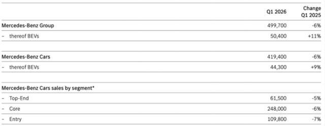 尽管 2026 年一季度奔驰在中国乘用车市场销量同比有所承压,但在欧美市场实现了销量回升。