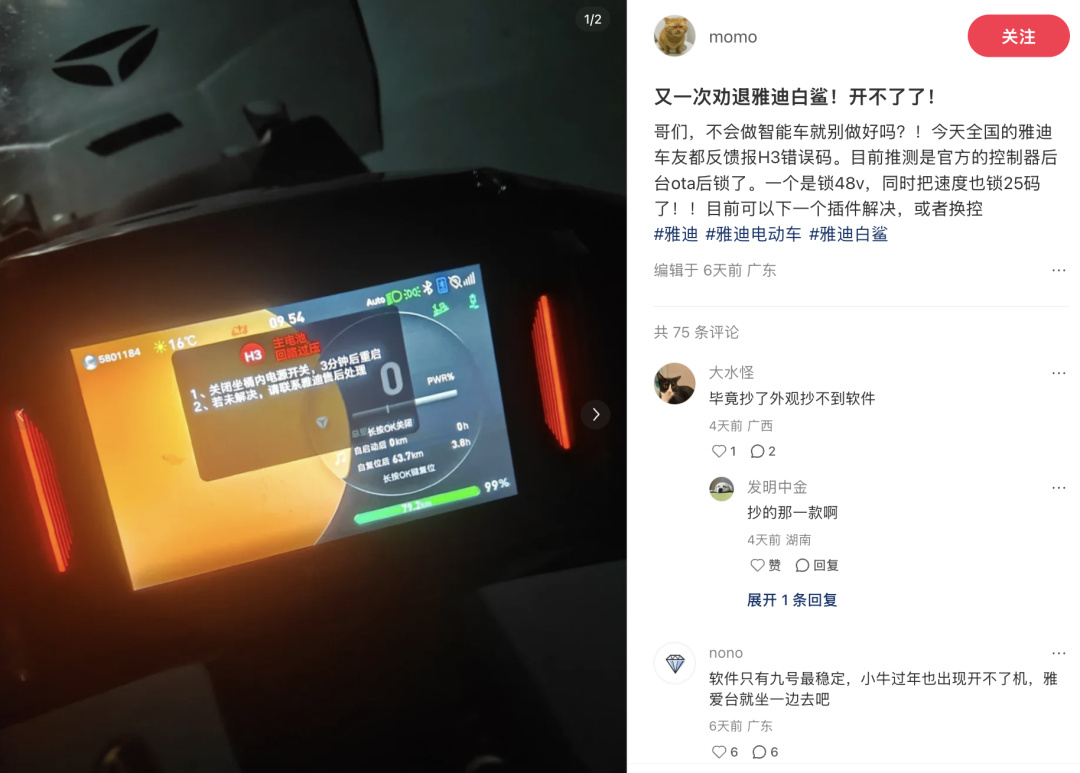 从广东到湖北,从海南到江苏,雅迪冠能系列旗下的白鲨、龙霆两款高端车型集体"罢工"。